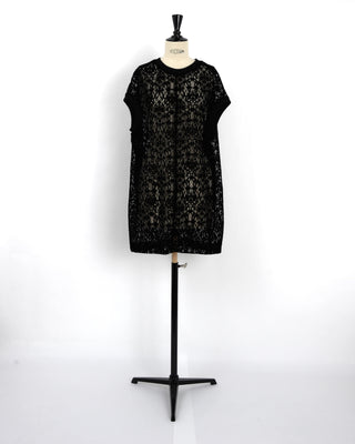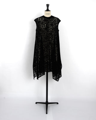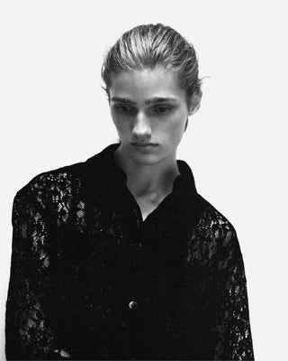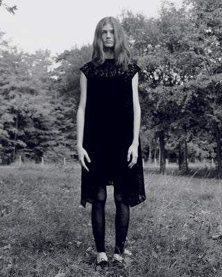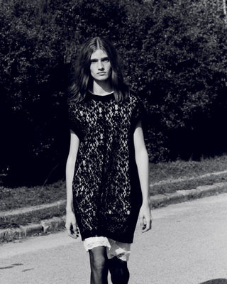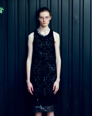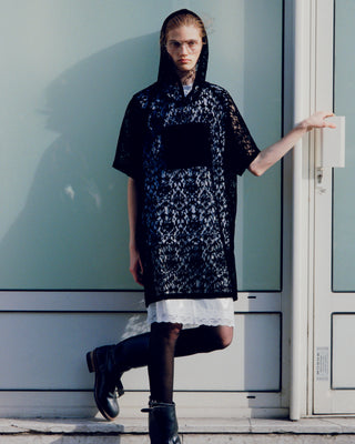 Inspired by flock lace and embroidery encountered in past work, reimagined into minimal, urban dresses with a '90s sensibility. Deliberately avoiding overtly feminine silhouettes, seeking instead an androgynous mood—lace worn without regard to gender. Lace on a man's body, lace styled loosely and nonchalantly by a woman—exploring the sensuality that emerges from these contrasts. By stripping away unnecessary details, the collection highlights the raw strength of lace itself through simplicity and restraint.